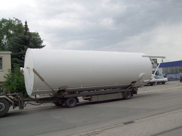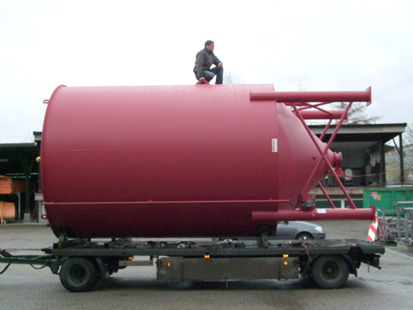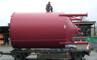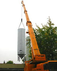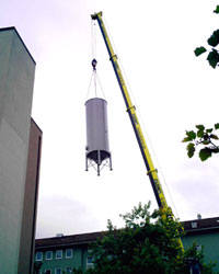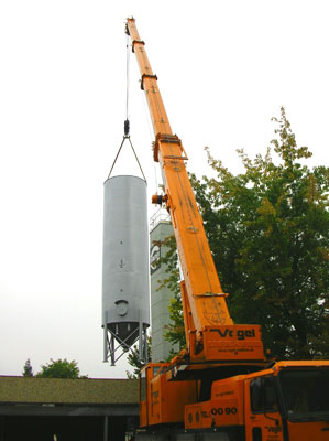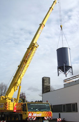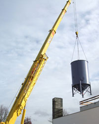 Aufstellung von Holzpellets-Silos durch Kranfahrzeug